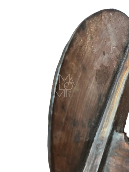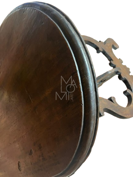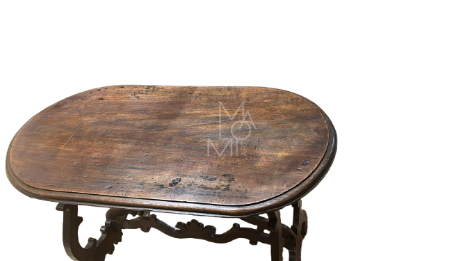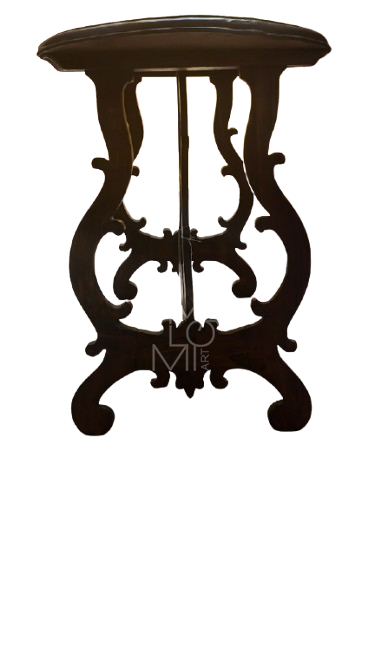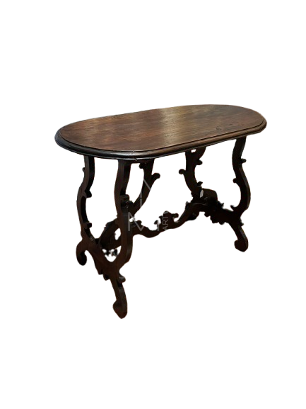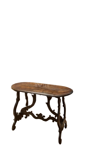 The top, carved from a single piece of wood using a gouge, is elliptical in shape and unusual in size, with a moulded edge carved into the solid wood. The structure is supported by Lira-shaped legs, connected by elegant moulded struts.