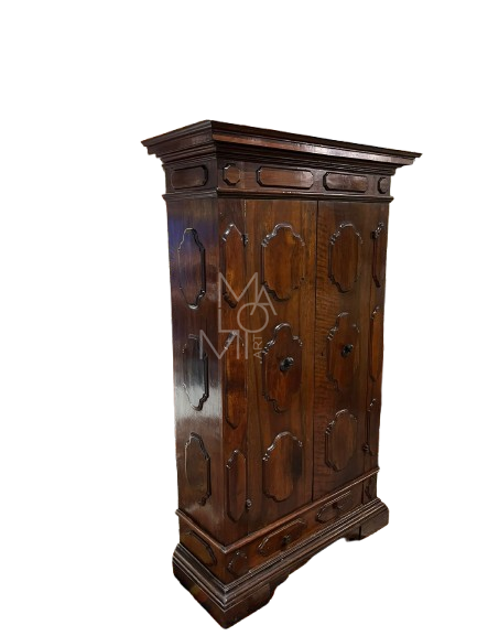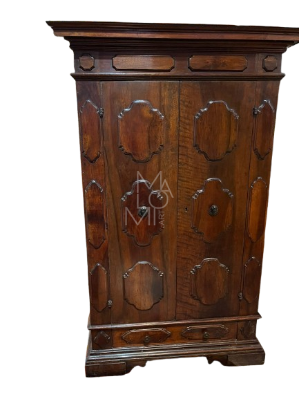 Stipo a due battenti a corpo unico in massello di noce, di provenienza emiliana, area bolognese risalente alla seconda metà del diciassettesimo secolo.